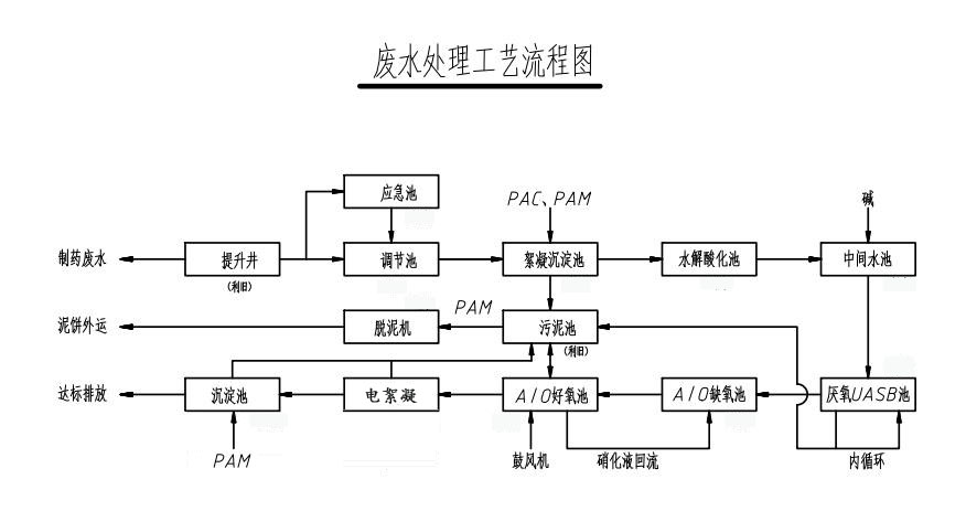 制藥廢水首先經過車間輸送管道進入提升井,再通過提升泵使廢水進入調節池調節水質及水量;經充分混合后廢水提升進入混凝反應沉淀池,去除SS及有機色素后進入水解酸化池,通過水解酸化菌的作用后再進入厭氧UASB系統,廢水在厭氧菌的作用下將難降解的物質降解為易降解的物質,將廢水中的大分子物質分解為小分子的物質,最終分解為CH4和H2O,此后進入A/O處理系統(,經過生物好氧菌的作用下進行生物降解除去BOD,同時脫氮除磷再進入電催化氧化裝置進行深度處理,最后經過沉淀池沉淀后達標排放。污泥經濃縮后用疊螺機壓濾后外運處理。